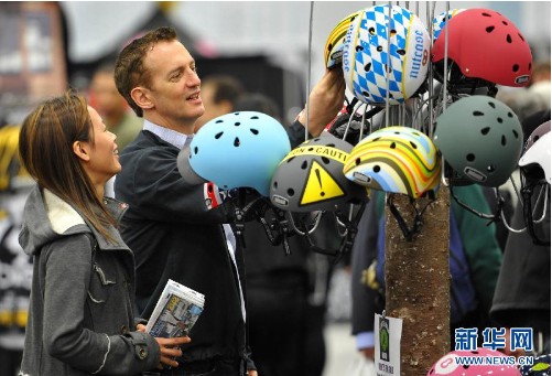 5月3日,參觀者在紐約自行車博覽會上選購自行車頭盔。當天,2012年紐約自行車博覽會開幕并免費向市民和游客開放。博覽會展示了功能多樣的自行車及配件,吸引大批市民觀看和體驗。(來源:新華網)