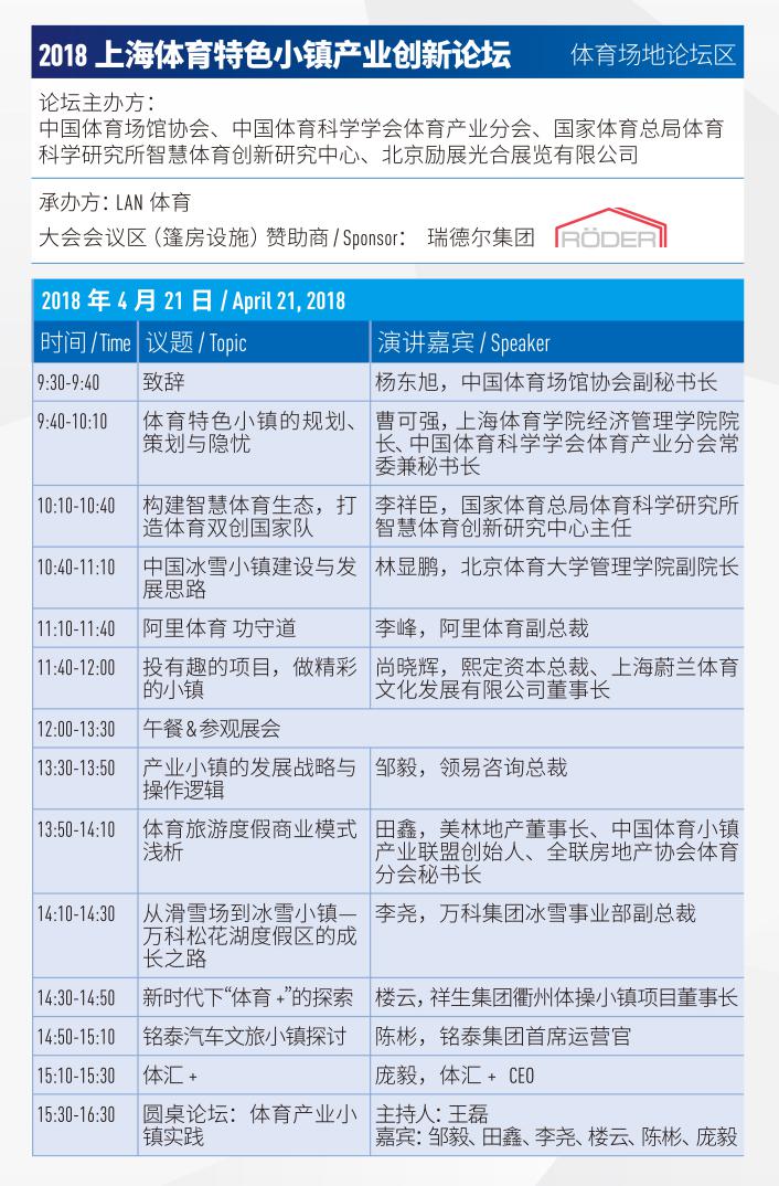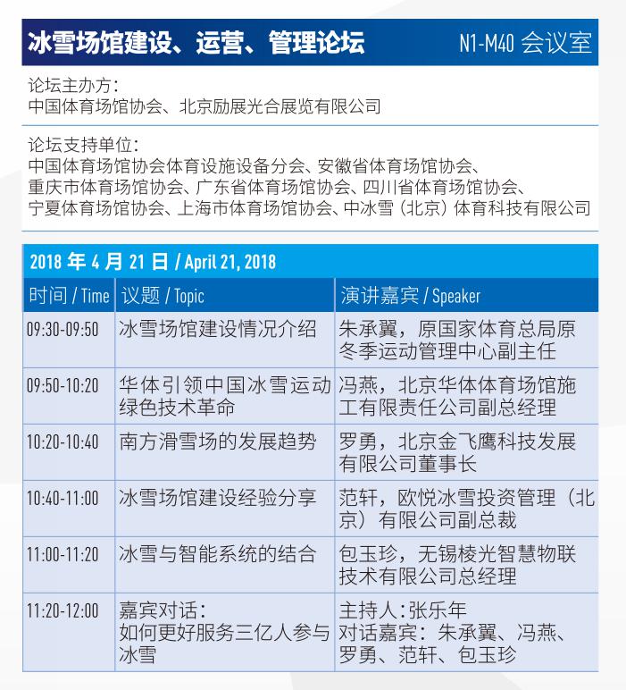 明天21日主題特色論壇“冰雪場館建設、運營、管理論壇”和“2018上海體育特色小鎮產業創新論壇”,也將分別于N1-M40會議室和館內體育場地論壇區舉辦。
