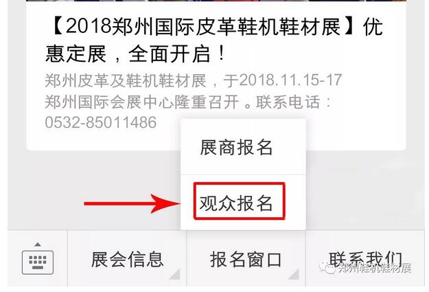 方式二:關注官方微信公眾號【鄭州鞋機鞋材展】,點擊微信公眾號底部菜單進行預登記。