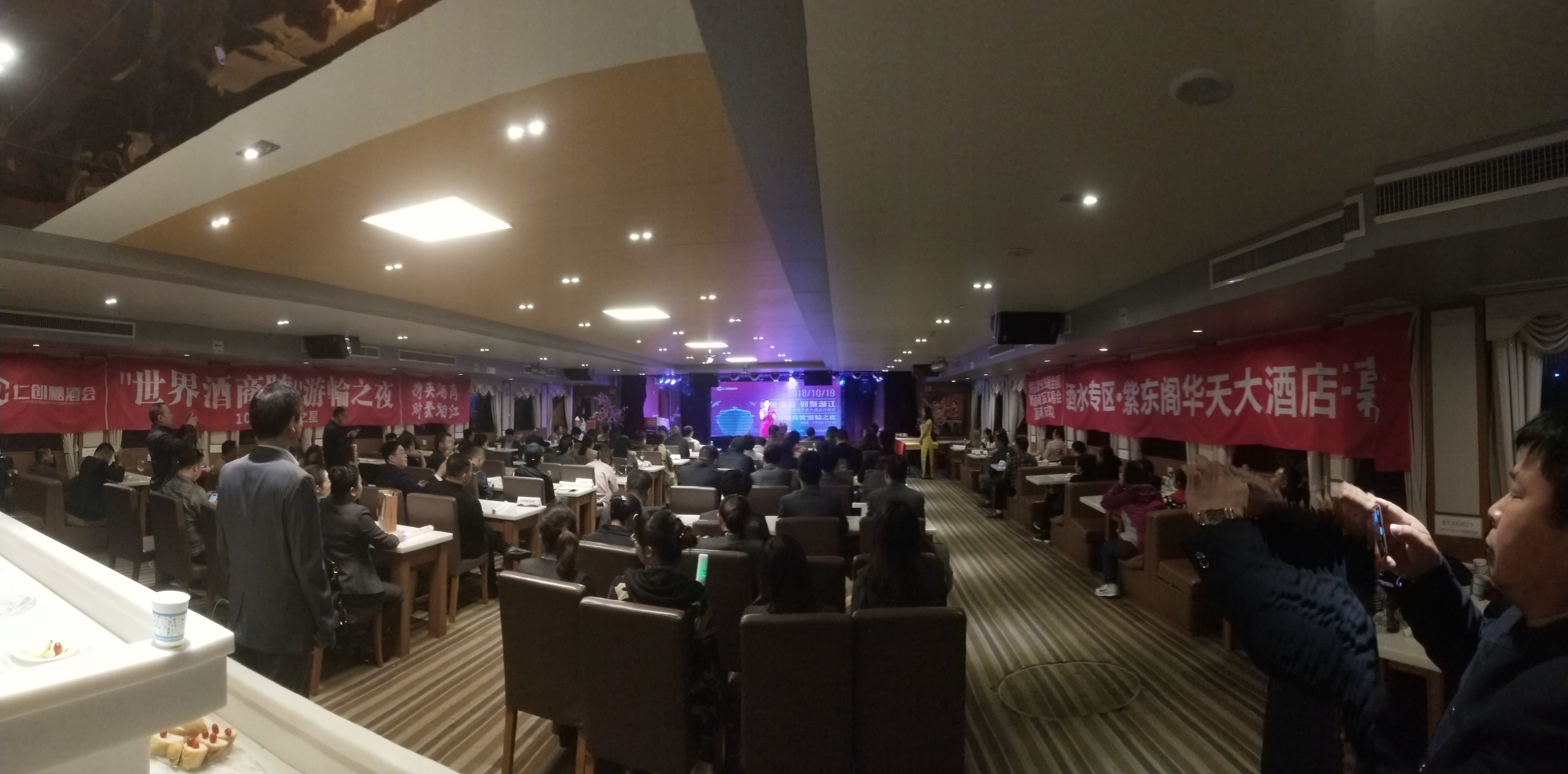 10月19日晚,近300全國名酒飲行業精英人士匯聚一堂,以別具湖湘特色的“游輪之夜”恭迎世界精英酒商,同期舉辦的紫東閣華天大酒店開幕儀式將整個晚會推向高潮,于湘江之濱于橘子洲頭為秋糖盛典狂歡。當晚高朋滿座,節目精彩紛呈。感恩省市主管部門、中酒協、湖南省酒業協會、湖南食品行業聯合會、湖南省食品質量安全協會、湖南省茶業協會、長沙市酒業協會、株洲市酒業協會、邵陽市市酒業協會、婁底市酒業協會等部門對仁創糖酒會的鼎力支持與幫助,為湖湘酒業酒商助威吶喊。以云酒頭條、糖煙酒周刊、新食品雜志、美酒招商網、紅網等媒體代表,以大韓貿易投資正興公社為代表的多位外國友人傾力出席。席間載歌載舞、歡聲笑語,難得一次橘洲夜游,再次深感星城多彩夜色。同時,在多方的大力支持與鼓勵下,明日將持續迎來紫東閣華天大酒店的正式展出。