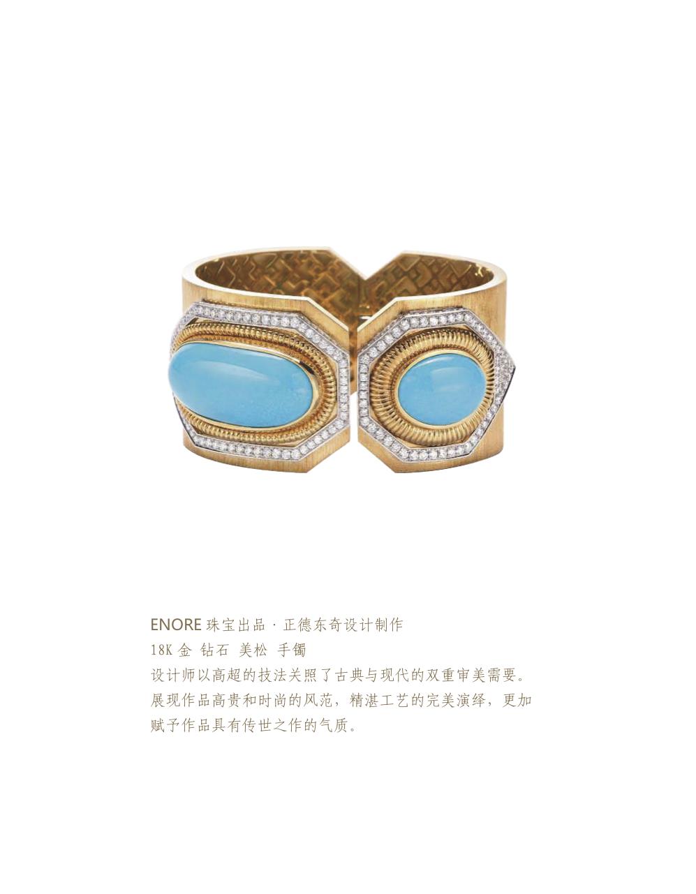 設計師以粗獷有力的金屬線條和明亮溫暖的配石色彩,恰到好處的迎合了大師雕刻作品。整件作品完美演繹出雕刻作品與金工鑲嵌的和諧融洽。配以繁復華麗的鑲嵌工藝。獲得第十屆中國上海玉石雕刻“玉龍獎”銀獎。