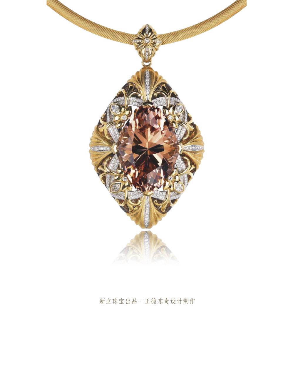 18K金-鉆石-摩根石,整件首飾以一顆高品質,特殊切割的摩根石為中心、承襲華貴復古的設計風格,配以繁復的金工鑲嵌。