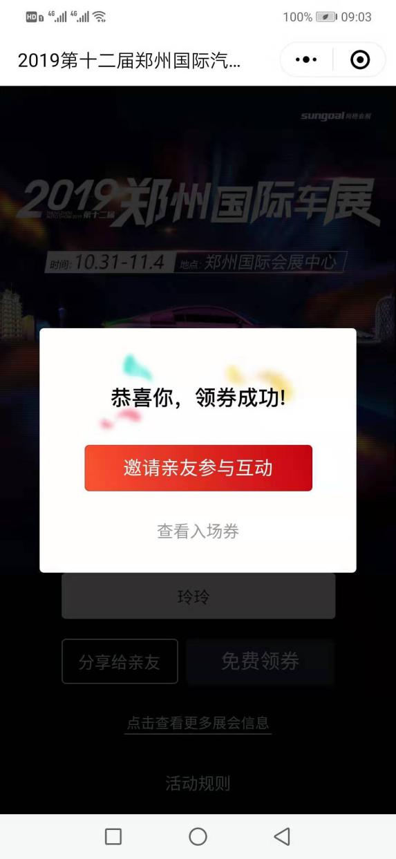 2、輸入手機(jī)號(hào)和驗(yàn)證碼點(diǎn)擊登錄,即可領(lǐng)取到免費(fèi)的鄭州國(guó)際車(chē)展門(mén)票;點(diǎn)擊“查看入場(chǎng)券”,即為車(chē)展電子門(mén)票,展期掃碼入場(chǎng)即可。