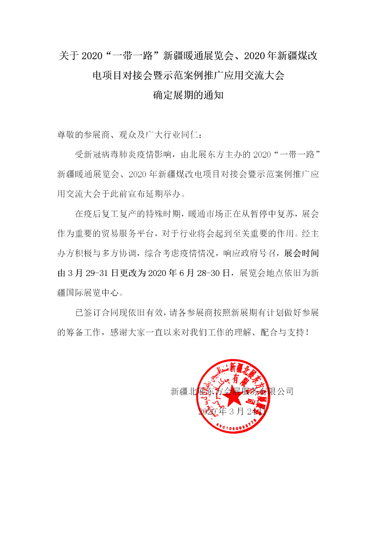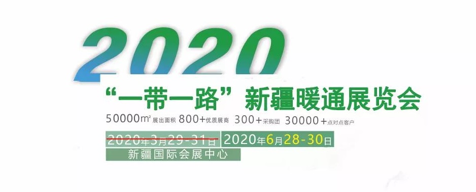 2020“一帶一路”新疆暖通展覽會、2020年新疆煤改電項目對接會暨示范案例推廣應用交流大會,現確定最新展期時間為2020年6月28日-30日,展覽會地點依舊為新疆國際會展中心。