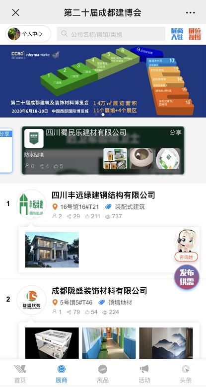 隨著信息技術(shù)的發(fā)展,成都建博會將線上線下雙線并舉的思路為引領(lǐng),目前全新打造的大家居建裝產(chǎn)品對接加盟云平臺——“成都建博會線上展會”已上線,平臺可滿足行業(yè)商家網(wǎng)上推廣、新品發(fā)布、商家宣傳、發(fā)布供需信息、線上展覽、商貿(mào)配對、客戶約見等訴求,實現(xiàn)線上展會海量曝光蓄客,線下展臺人氣爆棚,打造中西部家居建材行業(yè)首個線上+線下高效務(wù)實的貿(mào)易展會平臺。