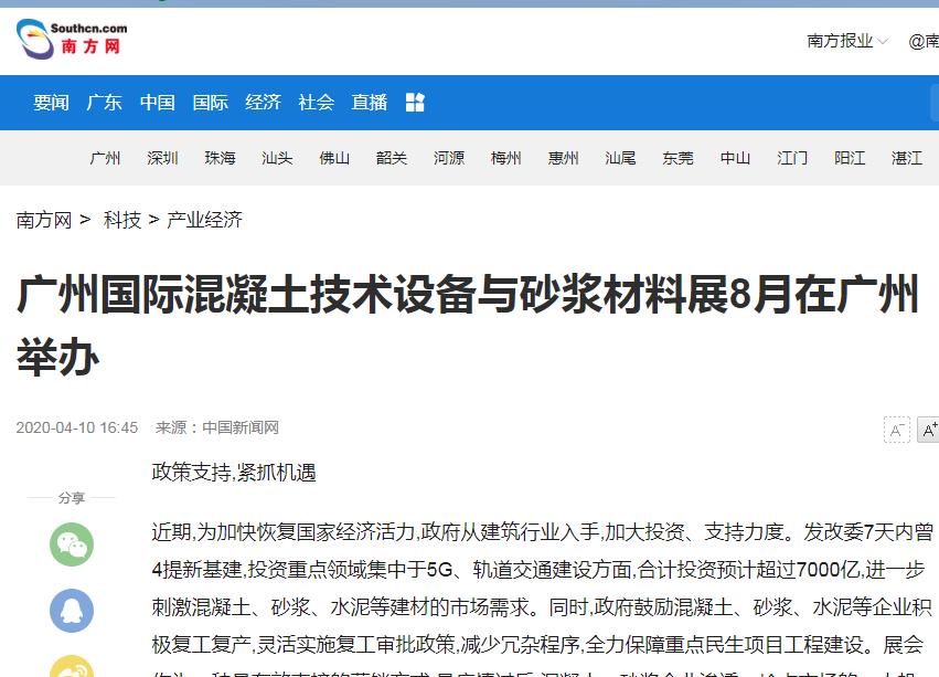 近百家知名媒體紛紛報道2020廣州國際混凝土與砂漿展