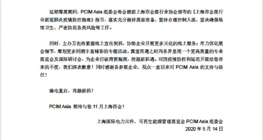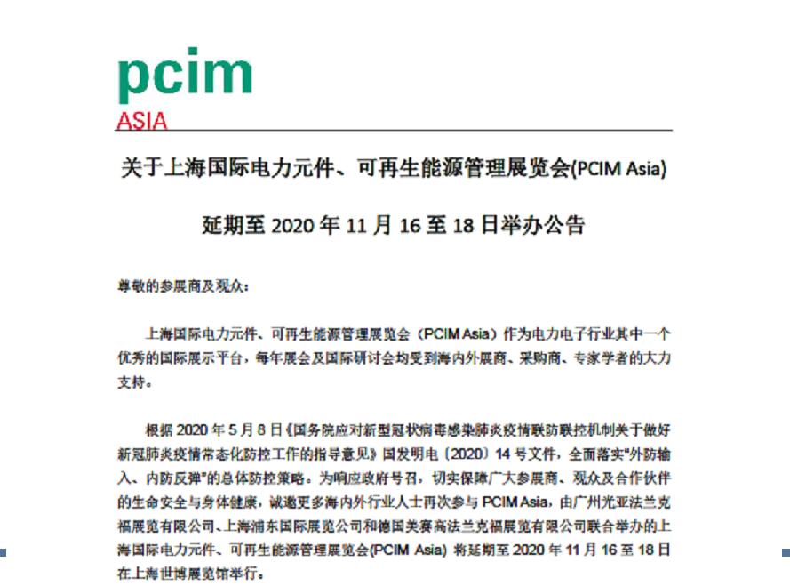 為遏制新型冠狀病毒感染肺炎疫情蔓延,多國(guó)都在執(zhí)行嚴(yán)格的出行限制措施。有鑒于此,PCIM Asia的主辦方宣布原定于7月初舉辦的PCIM Asia - 上海國(guó)際電力元件、可再生能源管理展覽會(huì)將延期至2020年11月16至18日于上海世博展覽館舉行。