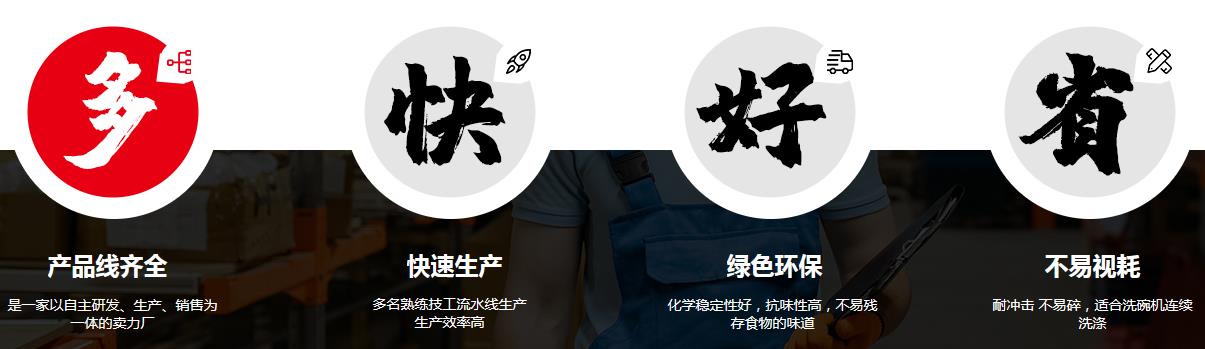 1、作為國內密胺餐具的優秀生產企業,工廠所有的產品從設計、原料、生產工藝、市場銷售-直以“視質量為生命,以服務創市場”為原則。