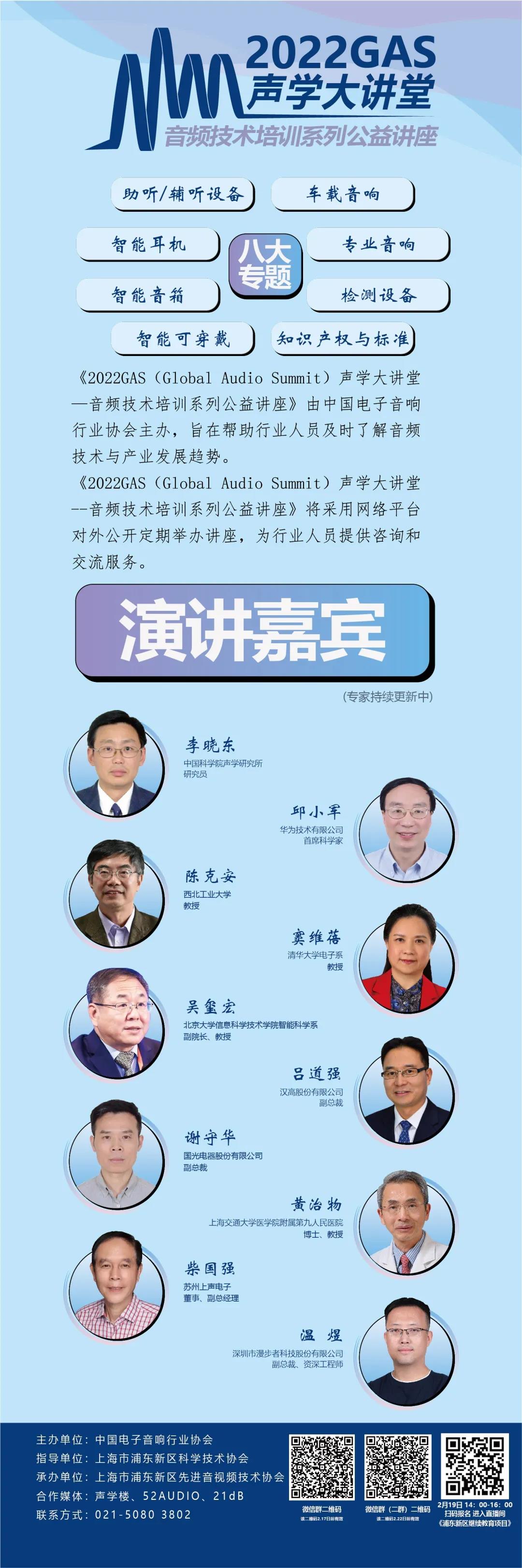 聲學大講堂——音頻技術培訓系列公益講座由中國電子音響行業協會主辦,協會邀請國內外聲學專家,基于互聯網平臺,實現隨時隨地互動學習,旨在幫助行業人員及時了解音頻技術與產業發展趨勢。
