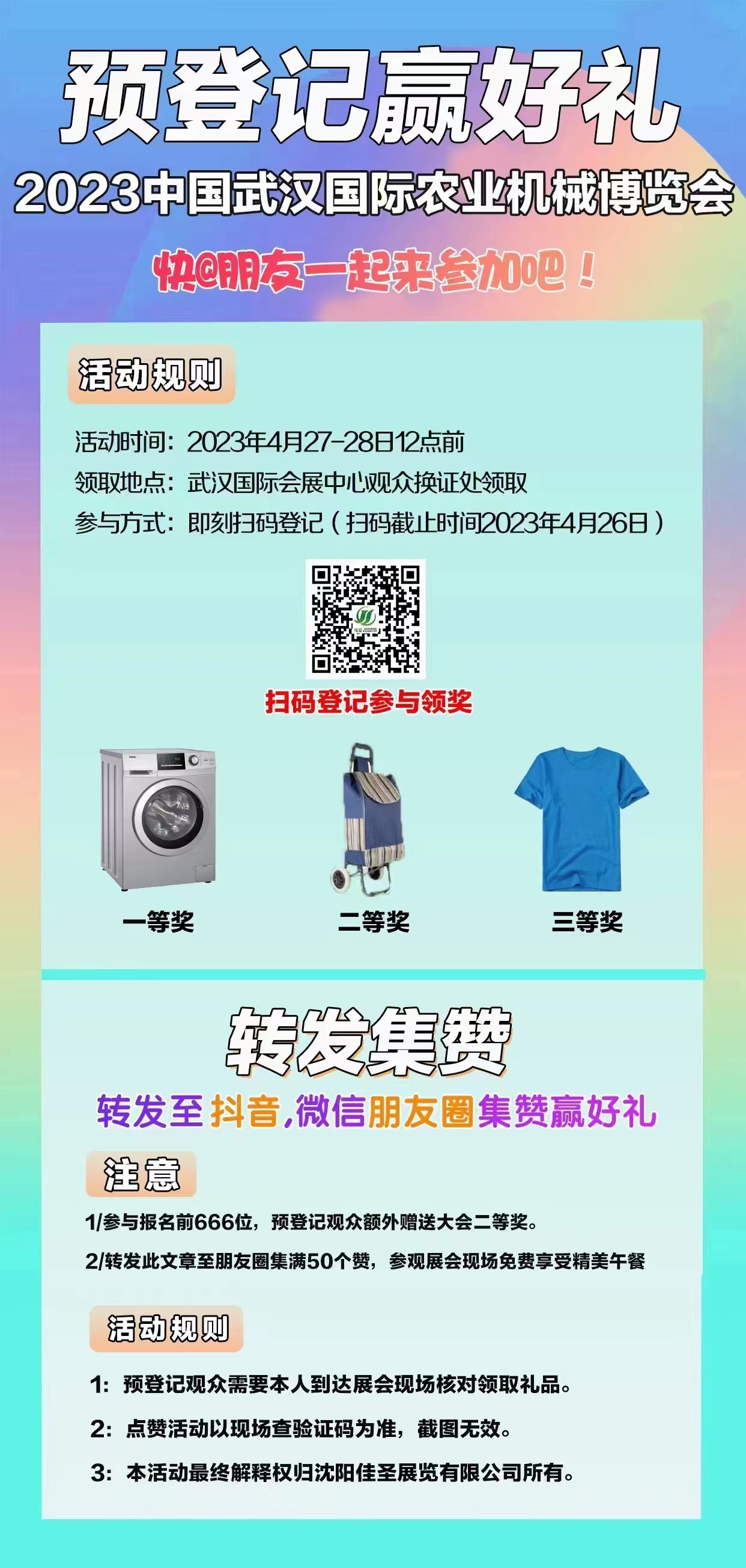4月24前通過掃描二維碼預登記或致電組委會預登記采購商即可參與現(xiàn)場抽獎活動,邀約小伙伴一起參觀的:滿50人即可安排大巴車免費接送,滿15人即可領取大會紀念禮品,滿30人預登記參觀可申請免費住宿。